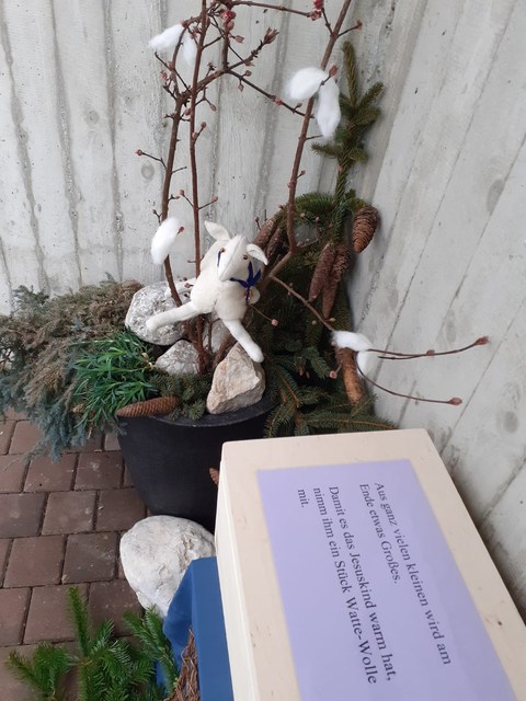 In den Pfarren Seefeld, Reith und Scharnitz wurde immer bei einer Station der Hinweis gegeben, wohin es weitergeht. In Leutasch haben wir eine Karte erstellt, die man am Beginn des Weges mitnehmen musste. Jeder wurde zur freien Gestaltung aufgerufen und Heidi und ich überlegten uns genau, was wir alles für jede Station brauchen. Durch die rechtzeitige Ankündigung waren bereits viele schon gespannt. Heidi und ich haben eine Nacht und Nebelstation gestartet, um alle Stationen aufzubauen, damit ich am nächsten Tag nur noch die "Mitnehmsachen" bereitstellen muss. Station war immer jemand anders anzutreffen, sei es ein weinendes Mädchen oder ein fröhlicher Hirte, der an einer Flöte spielt. Das Ziel war die leere Krippe in der Kirche. Zum Mitnehmen gab es eine Träne des weinenden Mädchens und eine Tonscherbe, denn ihr ist ein schöner Krug ihrer Oma aus der Hand gefallen. Bei einer Bäckerin, die für ihre kranke Nachbarin Brot gebacken hatte, gab es Holzscheitel zum Mitnehmen, damit es das besondere Kind, von dem alle sprechen auch warm hatte. An der nächsten Station hat sich ein Schaf im Busch an den Dornen verhangen. Die beiden Hirtenkinder haben das Schaf befreit, der Hirte war glücklich vor Sorge und gab den Kindern Wolle mit, um das kleine Kind zudecken zu können. Es war schon lange Dunkel geworden und die Kinder hörten Flötenmusik. Der fröhliche Hirte hab ihnen ein Lächeln mit. Vor der Kirche war dann dieser Stern, dem sie gefolgt sind. Anfangs haben sie sich nicht getraut weiter zu gehen. Schlussendlich habe sie all ihren Mut zusammengenommen und gingen zum Jesuskind.