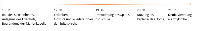 Als Spitalskirche begründet, die sich in besonderer Weise v.a. erkrankten und alten Menschen vor Ort angenommen hat, hat sich der Blick dieser Kirche verändert und auf jenen stillen Leidensdruck gerichtet, der im Trubel von Stadt und Alltag oft unterzugehen droht; auf eine Seelsorge als Sorge um die Seele. Die Kirche im Herzen der Stadt soll hier Räume fördern, in denen Begegnung stattfinden und ein Ausdruck gesucht werden kann für das, was im Leben wirklich bedeutsam erscheint.